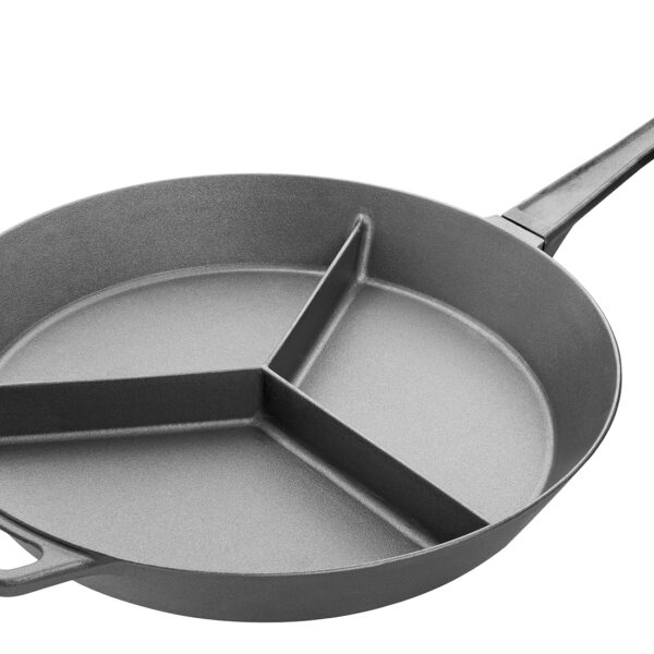 Patelnia duża 800, dzielona na 3, żeliwo, zdejmowane rączki, wysokość przegródki: 75 mm, wymiary: 800 mm, wysokość 120 mm, waga: 49,2 kg.