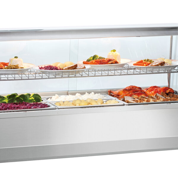 Witryna grzewcza 3/1 GN:- z szybą przednią giętą panoramiczną,- moc przyłączeniowa: 2,13 kW / 230 V 50 Hz,- wymiary: szer. 1080 x gł. 775 x wys. 600 mm,- waga: 76,2 kg,- pojemniki GN sprzedawane oddzielnie,- wyposażona jest w drzwi przesuwne.Witryny z półką i oświetleniem, wykonane ze stali chromowoniklowej 18/10, pojemnik na wodę do nawilżania wnętrza, zakres temperatur: 30 °C do 95 °C.