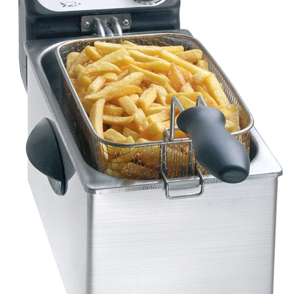 Frytownica elektryczna:- obudowa i pokrywa ze stali nierdzewnej,- element sterujący z tworzywa sztucznego,- 1 komora, 1 kosz, pojemność: 3 litry,- moc przyłączeniowa: 2,0 kW / 230 V 50 Hz 1 NAC,- wymiary: szer. 220 x gł. 400 x wys. 240 mm,- termostat bezpieczeństwa (ochrona przed przegrzaniem),- waga: 2,7 kg,- urządzenie nie jest przeznaczone do pracy ciągłej w zastosowaniu przemysłowym.Chrupiące i kruche dania dzięki frytownicom Firmy Bartscher:Złoto-żółte frytki, chrupiące sznycle, kruche wypieki lub jędrne, soczyste sajgonki - frytowanie pozwala na smaczne i szybkie przygotowanie produktów spożywczych. Oferujemy Państwu wybór frytownic pozwalający na ich wszechstronne wykorzystanie do różnorodnych celów: od frytownic pomocniczych do stojących modeli o wysokiej wydajności. Dzięki frytownicom Firmy Bartscher będą Państwo dysponować optymalnym wyposażeniem do przygotowywania chrupiących i kruchych dań.RADY DOTYCZĄCE OPTYMALNEGO FRYTOWANIA:W ten sposób produkty spożywcze i frytownica nie ulegną zniszczeniu.W trakcie frytowania należy przestrzegać kilku zasad, aby powstały produkt był zdrowy, chrupiący i smaczny, a frytownica niezależnie od tego, na jaki model Państwo się zdecydowali - długo świadczyła swoje dobre usługi.Właściwe napełnienie kosza:Zagwarantowane jest wtedy, gdy frytowane produkty swobodnie pływają. Obowiązuje żelazna zasada: stosunek frytowanego produktu do tłuszczu powinien wynosić ok. 1:10, ale nie należy przekraczać połowy wypełnienia kosza.Optymalna temperatura:Waha się pomiędzy 170 a 180°C. Jeśli tłuszcz jest zbyt gorący, zmniejsza się jego trwałość, a przy zbyt niskiej temperaturze do produktu przenika nadmierna ilość tłuszczu.Odpowiedni do frytowania tłuszcz:W handlu dostępne są tłuszcze o różnych konsystencjach i różnej jakości. Stosowanie półpłynnego lub płynnego tłuszczu o wysokiej jakości zwróci się wielokrotnie: w smaku frytowanego produktu, w prostym i szybkim używaniu tłuszczu, i w jego trwałości.Dostateczna staranność:I przestrzeganie wytycznych dotyczących higieny decydują o trwałości i bezawaryjnym funkcjonowaniu sprzętu. Wskazówki odnośnie mycia, konserwacji i obsługi sprzętu znajdą Państwo w instrukcji obsługi, co pozwoli na oferowanie najlepszej jakości przez długi czas.