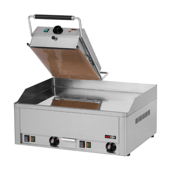 • Płyta robocza chromowana - powierzchnia nieprzywieralna• Powłoka chromu powoduje mniejszą emisję ciepła, tym samym mniejsze zużycie energii• Płyta robocza spawana z rantem (szczelność, higiena, komfort pracy)• Odpowiednia grubość płyty roboczej - 10 mm - gwarantuje idealne rozprowadzenie i utrzymywanie temperatury• Kontrolka pracy i grzania• Urządzenie posiada szufladę na tłuszcz• Osobne sterowanie dolnej i górnej płyty• Płótno teflonowe zapobiegające przywieraniu na górnej płycie grzejnej• Moc: 6 kW + 3 kW• 1x płyta górna, 2x podgrzewana powierzchnia, oddzielne sterowanie każdej powierzchni• Zasilanie: 400 / 50 Hz, 230 V / 50 Hz