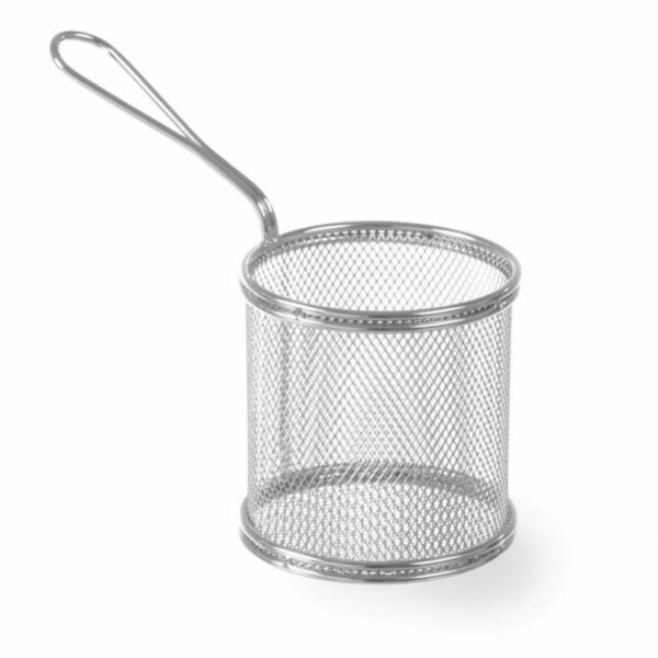 Koszyk miniaturowy do smażonych przekąsek okrągły. Wysoka jakość wykonania. Do zastosowania w każdej kuchni. Produkt wykonany ze stali nierdzewnej. Można myć w zmywarkach.