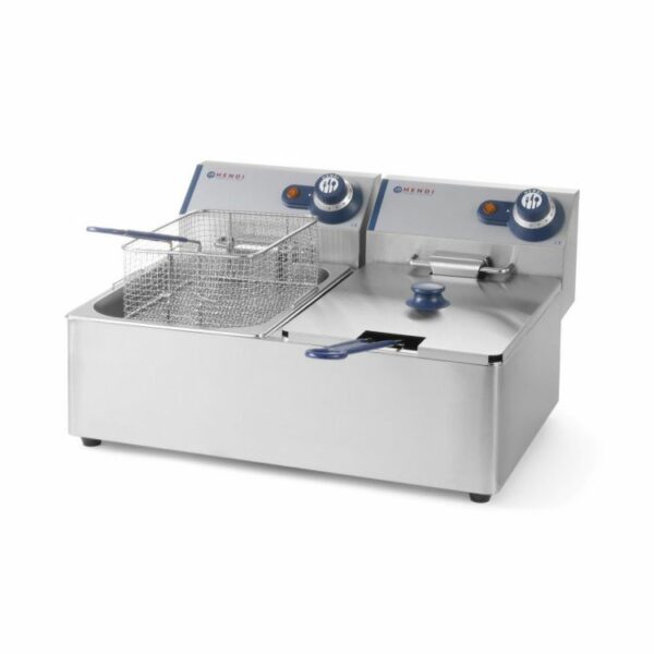 Frytownica Blue Line o pojemności 2x6 l. Model rekomendowany jest do mniejszych punktów gastronomicznych. Obudowa ze stali nierdzewnej 18/0. Pojemnik na olej ze stali nierdzewnej. Lampka kontrolna informującą o pracy urządzenia. Regulacja temperatury do 190°C . Zabezpieczenie przed przegrzaniem z funkcją resetowania. Wyjmowany koszyk z długim izolowanym uchwytem. System zimnej strefy oddziela pozostałości smażenia poniżej poziomu grzałek, zwiększając wydajność tłuszczu. W zestawie koszyk oraz pokrywa.