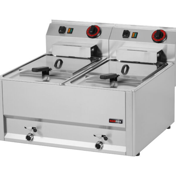 Frytownica elektryczna dwukomorowa 2x 8 l z kranem spustowym, nastawna, 6 kW, 660x600x290 mm | REDFOX, Linia 600, FE60EL