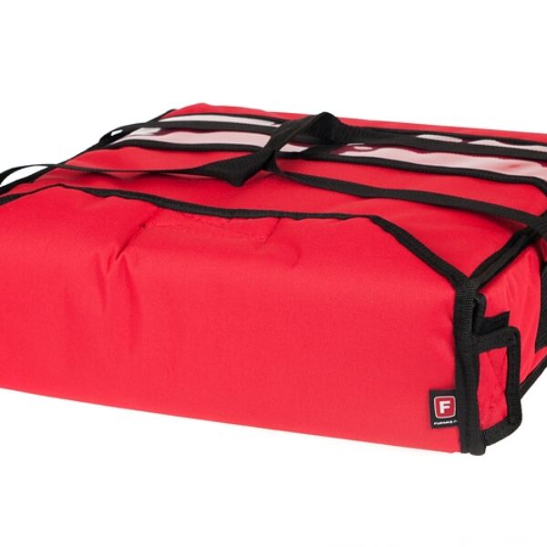 Podgrzewana torba na kartony do pizzy, czerwona z czarną lamówką, wykonana z mocnego i łatwo zmywalnego materiału - kodura, zamykana na magnes, z przeźroczystą kieszenią na rachunki. Posiada możliwość zastosowania w systemie BagOnBag, który pozwala na spięcie ze sobą kilku toreb w różnych rozmiarach. Nóżki z tworzywa sztucznego i miękkie rączki ułatwiają wygodne chwytanie uszu i komfortowe przenoszenie. Opakowania izotermiczne firmy FURMIS nie tylko pozwolą zaoszczędzić czas i pieniądze, ale pozwolą również poprawić jakość Państwa usług. Zapewnia możliwość utrzymania temperatury w granicach 65 stopni celsjusza. Moc znamionowa 100W, torby są przystosowane do pracy w instalacji 12V, posiadają zabezpieczenia termiczne. Idealnie nadaje się do transportowania 2 pudełek na pizzę o wymiarach 400x400 mm.