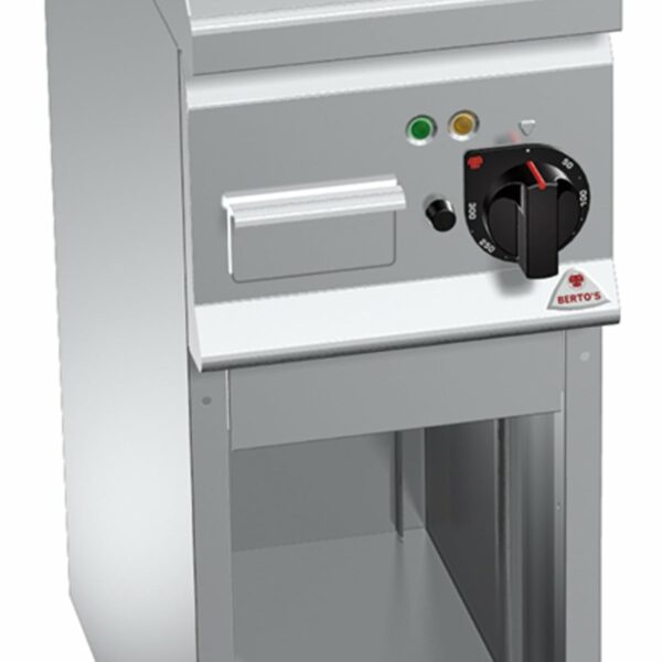 • Powierzchnia robocza ze stali nierdzewnej AISI 304• Rezystancje ze stali incoloy umieszczone pod płytą gotującą• Kontrola termostatyczna oraz awaryjny termostat uzbrajany ręcznie• Regulacja temperatury od 50 °C do 270 °C• Lampka kontrolna linii i osiąganej temperatury• Ryflowana płyta z satynowanej stali z osłonami antybryzgowymi• Powierzchnia gotowania lekko pochylona, z otworem odprowadzającym o dużych rozmiarach oraz przewód odprowadzający ciecze bezpośrednio do szczelnego zbiornika• Nogi nastawne• Wyposażenie opcjonalne (za dopłatą): teflonowy korek zamykający, skrobak, drzwi do szafki/podstawy