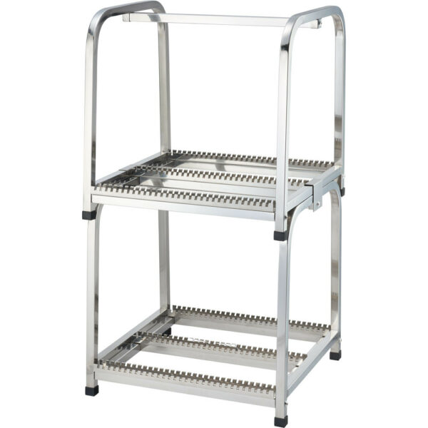 2-półkowy regał ociekowy przystosowany do pojemników GN 1/1 oraz tac. Zaleca się umiejscowienie regału w pobliżu kratki ściekowej.
