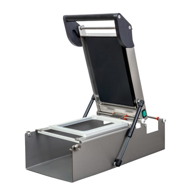 Główne cechy urządzenia:- pakowanie tacek do rozmiaru 265x185 ( w tym np. dwie tacki fi115mm - jedna za drugą )- ramię zgrzewające ułatwiające prace - zwiększa siłę docisku- płynna i precyzyjna regulacja temperatury zgrzewania- ramki wymienne wykonane z aluminium anodowanego ( można stosować matryce z modelu AG02e/A190e )- siłowniki pneumatyczne ułatwiające otwarcie- płyta zgrzewająca teflonowana- głębokość tacki do 155mm- wysokość po otwarciu ok. 550 mm- wymiary ok. 550x290x220mm- moc grzewcza 750W- czas zgrzewania ok 2 sekund- czas nagrzania ok 10 min- automatyczne odcięcie folii z rolki po długości- konstrukcja urządzenia wykonana ze stali nierdzewnej # 3mmOpcja:Dodatkowe wymienne matryce - dopasowane do wskazanego opakowaniaDodatkowe wymienne narzędzie tnące folię górną - dopasowane do wskazanego opakowania