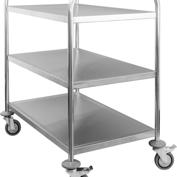 • Wózek trzypółkowy wykonany ze stali nierdzewnej• Maksymalnym udźwigu - 50 kg na półkę• Posiada 4 obrotowe gumowe kółka, w tym 2 z hamulcami• Wózek do samodzielnego montażu• Odległość między półkami 270 mm• Powierzchnia robocza: 795 x 505 mm• Nie posiada maty wygłuszającej
