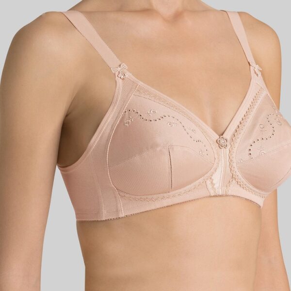 Klasyczny model marki Triumph z miękkimi miseczkami bez fiszbin. Model wykonany z elastycznego materiału z dodatkiem bawełny. Miseczki trójdzielne, zapewniają doskonałe trzymanie oraz modelowanie biustu. Boczne fiszbiny zapewniają jeszcze większy komfort noszenia. Miseczki u góry ozdobione delikatnym haftem. U dołu mała baskinka.Skład: 60% Poliester, 28% Cotton, 7% Poliamid, 3% Elastan, 2% Wiskoza