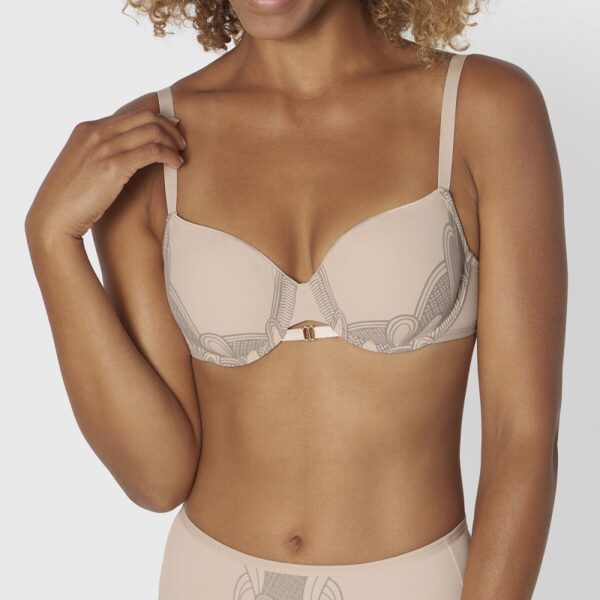 Delikatnie usztywniony, zabudowany biustonosz z modelującymi fiszbinami. Lekkie i oddychające miseczki Spacer Cup podkreślają naturalny kształt biustu bez dodawania mu objętości. Model z gładkiego jerseyu zdobionego graficznym nadrukiem, pokryty przezroczystym tiulem. Pod mostkiem satynowe tasiemki połączone metalowym detalem. Boki oraz tył wykonane z gładkiej, miękkiej tkaniny tkaniny pokrytej delikatnym tiulem. Model uszyty z zastosowaniem technologii Lycra FitSense, która gwarantuje niewiarygodny komfort niczym druga skóra. Skład:53% Poliester, 29% Poliamid, 18% Elastan.