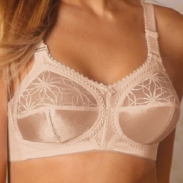 Mocno zabudowany biustonosz bez fiszbin z klasyczne linii Triumph. Miękkie miseczki w górnej częsci wykonane z kwiecistej koronki, w dolnej z połyskującego, ekskluzywnego materiału. Pomiędzy miseczkami ozdobna kokardka z diamencikiem. Boczne fiszbiny oraz trójdzielne miseczki utrzymują biust w niezmienionej pozycji. Szerokie, regulowane z przodu ramiączka zapewniają komfort noszenia. Dostępny również w dużych rozmiarach.Skład: 75% poliamid, 25% elastan.