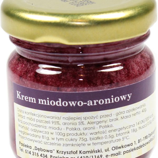 Jak wszyscy dobrze wiemy, naturalny miód pod wpływem czasu zmienia się w stałą konsystencję z grubymi i twardymi kryształkami. Aby ułatwić nabieranie miodu na łyżeczkę, powstał proces tak zwanego kremowania, który podczas mieszania/ucierania rozdrabnia kryształki miodu aż do uzyskania kremowej konsystencji natomiast nie pozbawia go jakości i niepowtarzalnego smaku. Dodatek bogatej w witaminy aronii sprawi, że miód idealnie będzie się komponował w połączeniu z herbaty i innymi rozgrzewającymi napojami oraz jako dodatek do deserów i wielu innych dań.